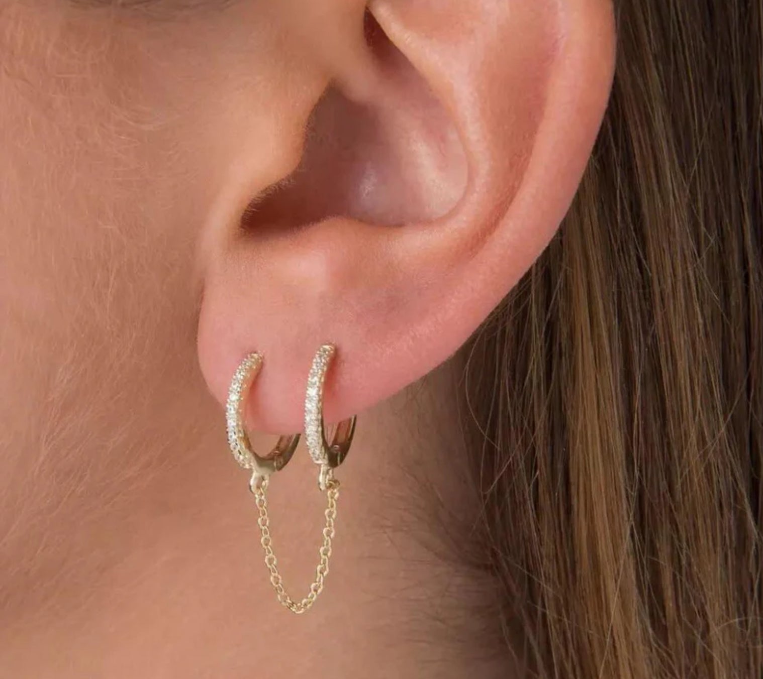 Sterling silver with 14k gold filled pave double Huggie earring with chain.